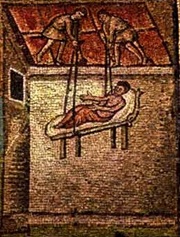 Quatre hommes portant un paralytique sur son grabat le hissent auprès